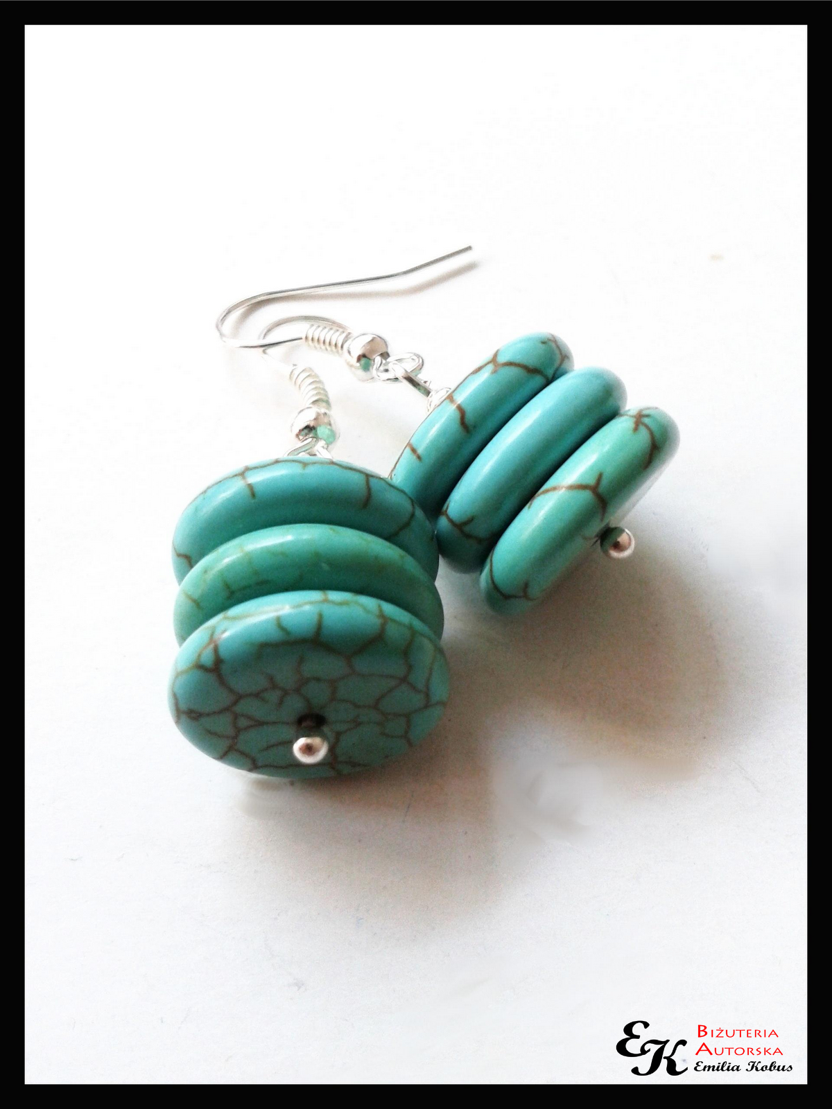 Kolczyki wykonane z krążków howlitu (14mm). Całość dopełniają posrebrzane elementy półfabrykatów. Długość kolczyków wraz z biglem 3,5 cm.